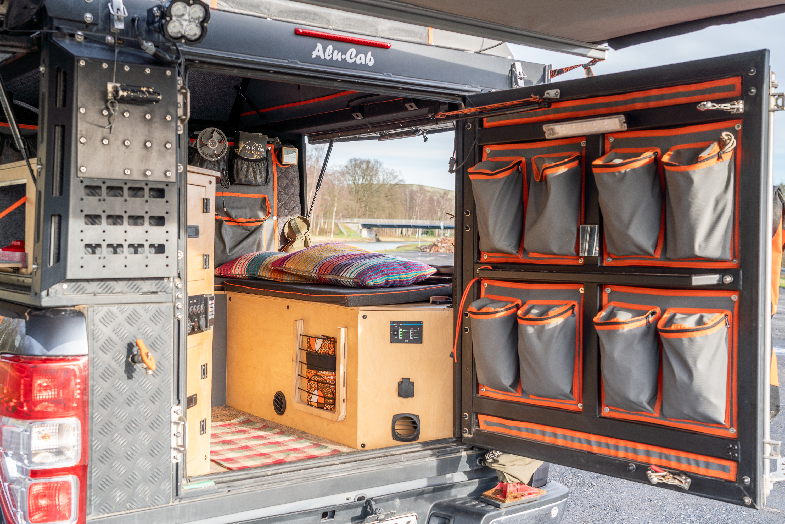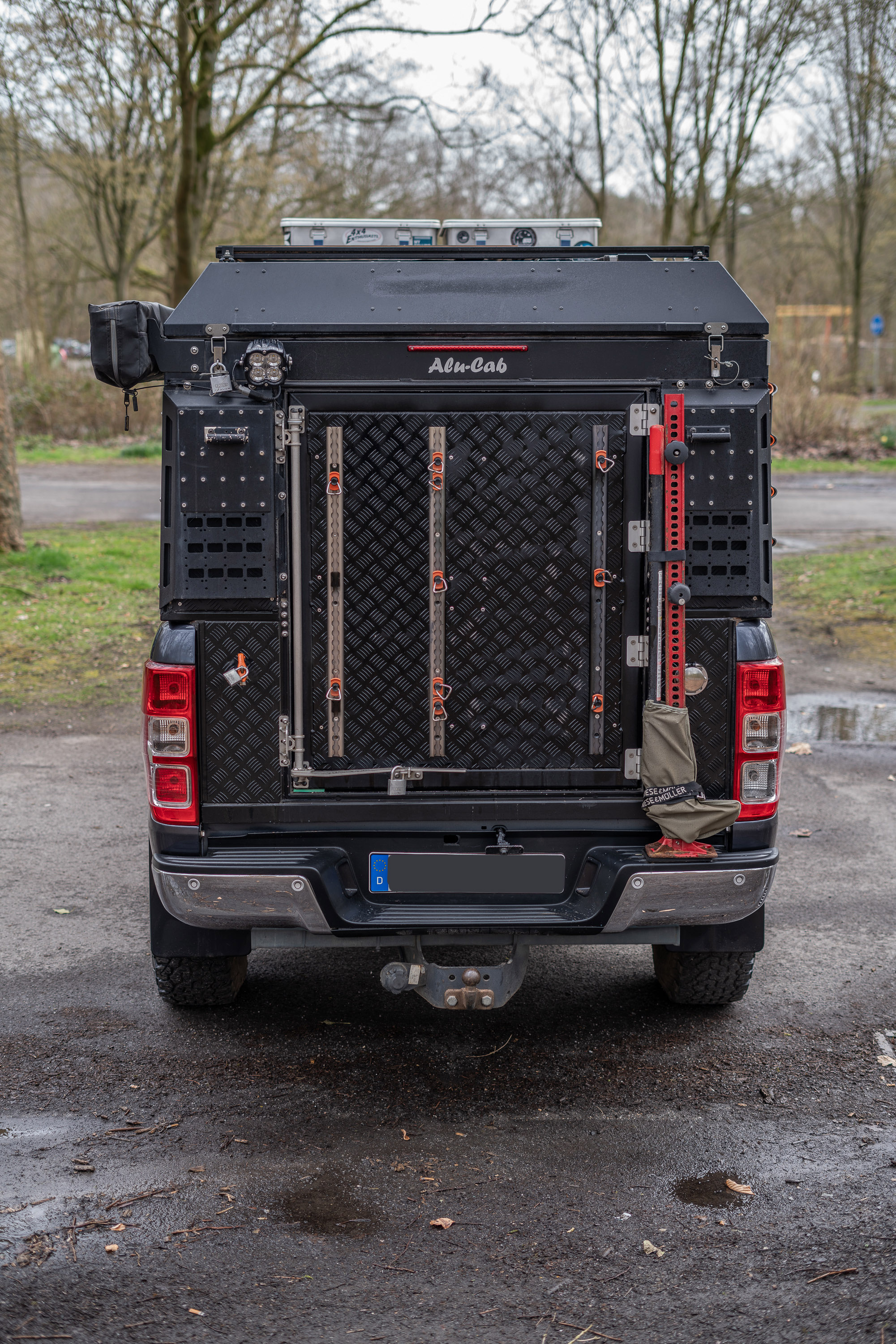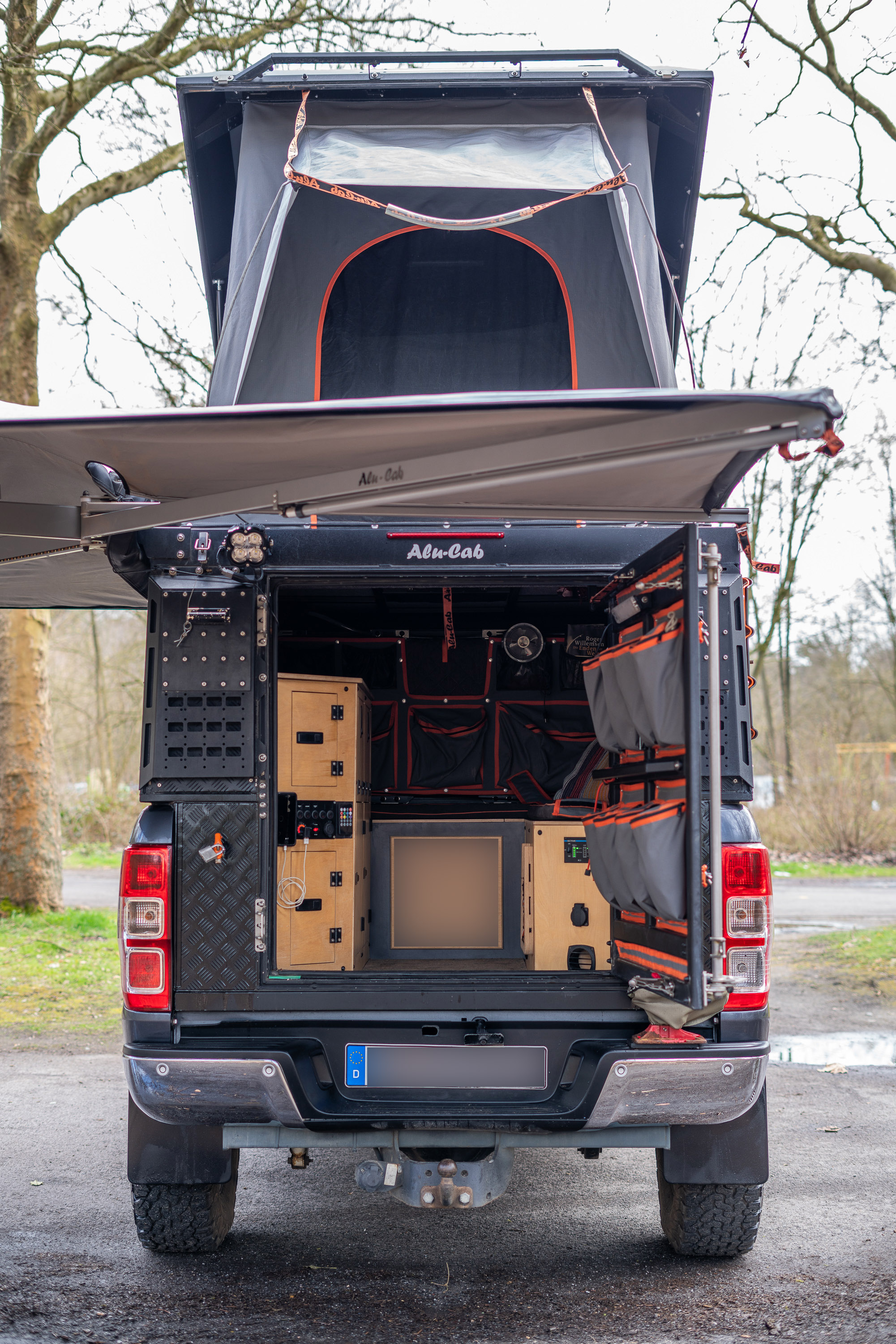 - Alu Cab Canopy Camper Aufbau, Alu Cab Falttisch unter dem Canopy-Dach, Alu Cab 50L Wassertank, Stautaschen an Hecktür,, 5 dreistufig dimmbare LED-Lampen, schaltbar in rot und weiss, zusätzlich Leselampen und USB-Lader im Schlafbereich, abschließbarer Wasserauslass neben der Hecktür