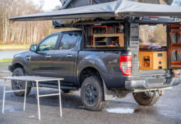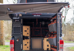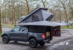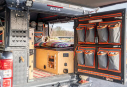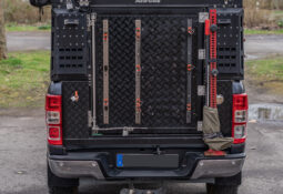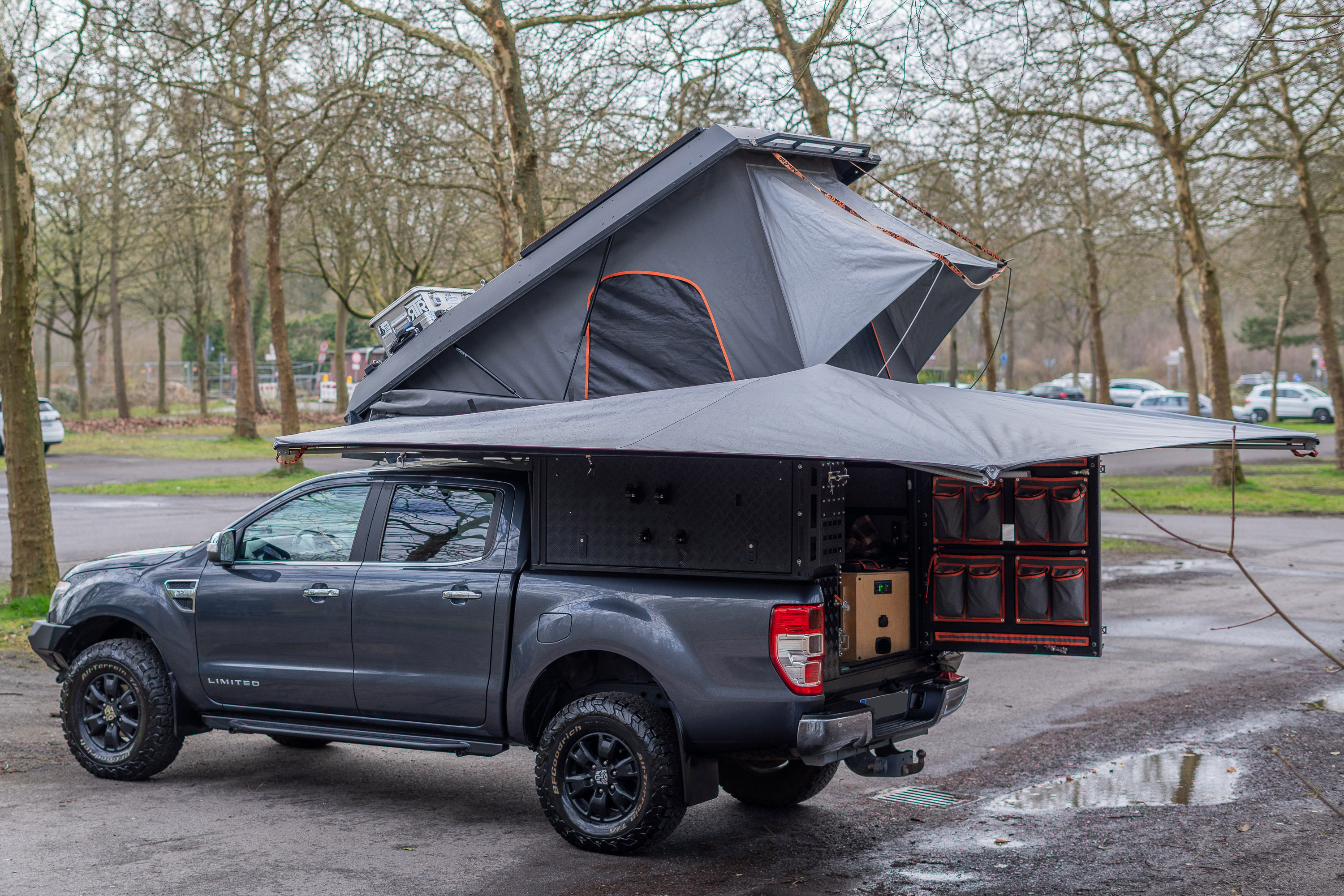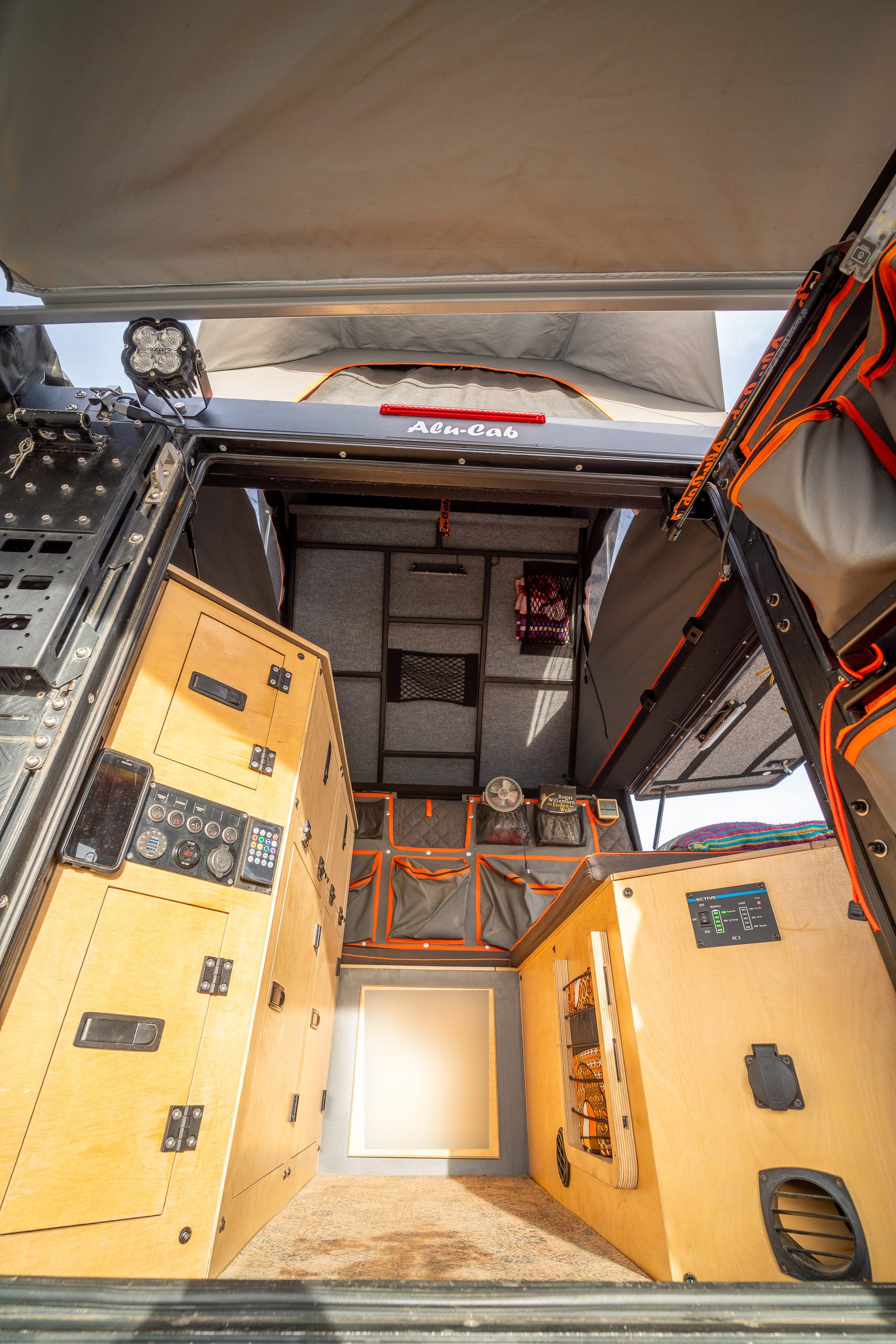 - Alu Cab Canopy Camper Aufbau, Alu Cab Falttisch unter dem Canopy-Dach, Alu Cab 50L Wassertank, Stautaschen an Hecktür,, 5 dreistufig dimmbare LED-Lampen, schaltbar in rot und weiss, zusätzlich Leselampen und USB-Lader im Schlafbereich, abschließbarer Wasserauslass neben der Hecktür