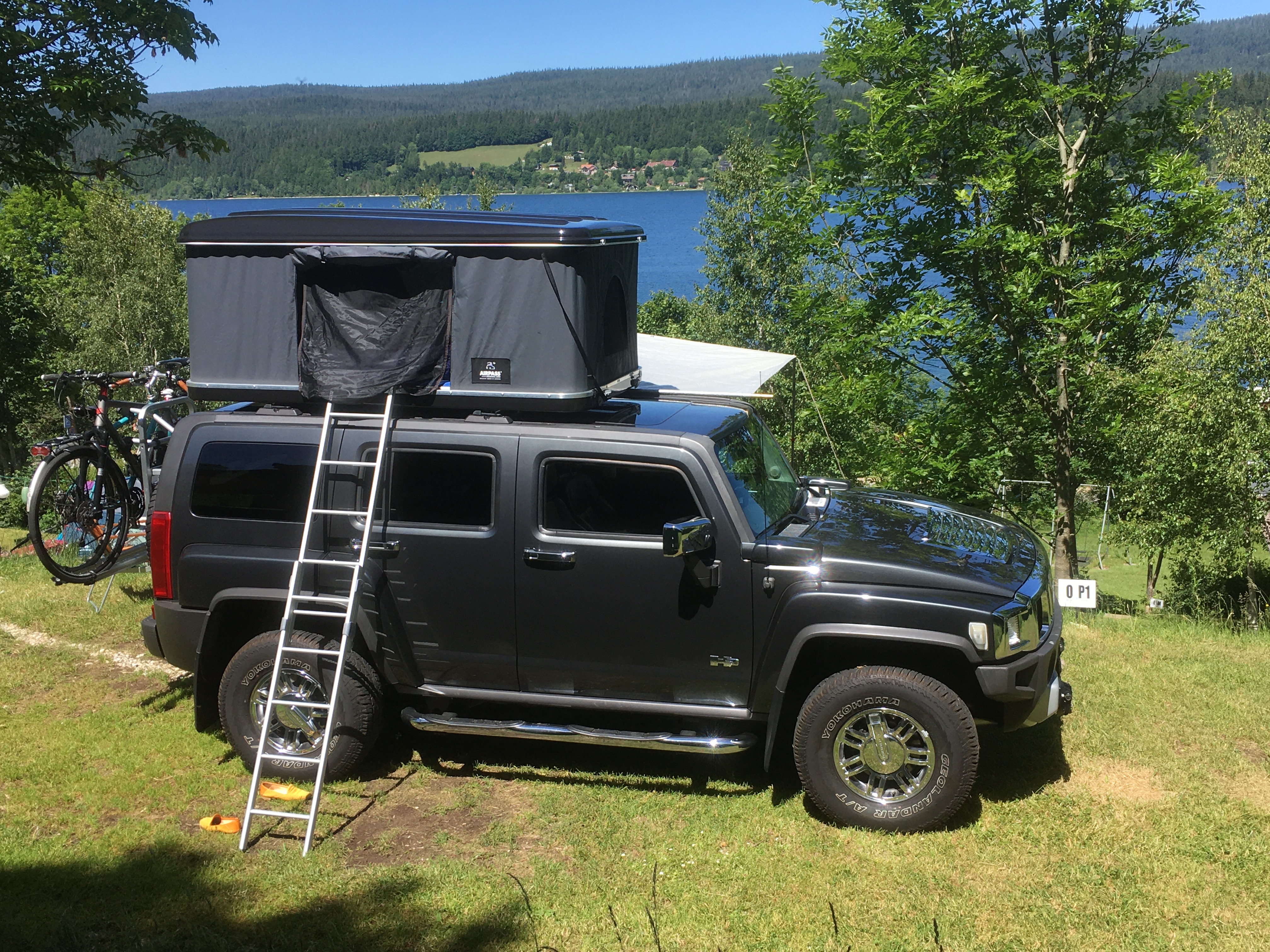 Seltener Hummer H3 Alpha V8 Vortec (mit Zylinderabschaltung), 305 PS. Nur 83’000 km garantiert. Einziges Angebot eines H3 Alpha V8 in der Schweiz. 4×4 mit Untersetzung, Getriebesperre, Klima. Unterboden komplett vom Landrover-Spezialisten Leisurecars in Uetendorf aufgearbeitet, Brunoxbehandlung, Schutzlack, Wachsbehandlung. Technisch und optisch Topzustand. Offroadcamper mit Dachzelt Maggiolina Airpass (nur 25 cm hoch) 3x gebraucht, Fr. 3’680 Neupreis, Kühlbox 12V/220V/Gas, Gestell für Campingutensilien, Koffer für Kleider usw. Veloträger, Vordach .