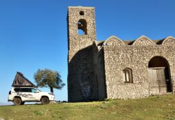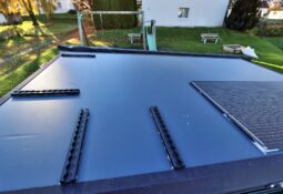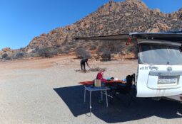 Mein Dachzelt ist übrigens ein Hartschalenzelt von GEAR ROCK aus Aluminium. Daran hängt die 270 Grad Markiese von ALU-CAP. Die Halterung habe ich auch selbst geplant und sie hält sehr stabil. Auf dem Zelt ist ein 100W Solarpannel hinterlüftet montiert – bring bei guter Sonnenbestrahlung so 80 Watt. Weiter habe ich auf dem Dach die Sandschaufel und die Sandbretter transportiert – daher die Airline Schienen.