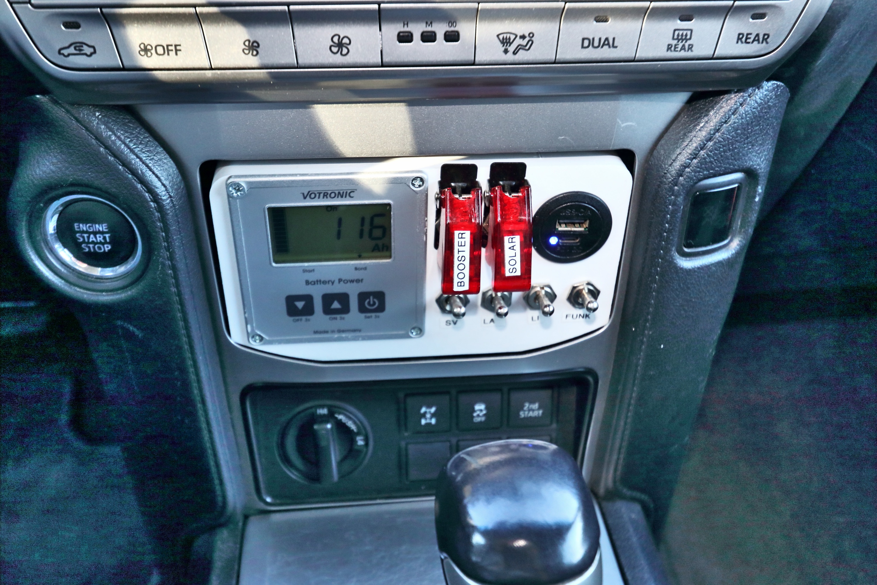 Vorne habe ich ein Controlpannel installiert, wo ich den Ladezustand der Batterie überprüfen kann. Weiter habe ich da noch Kippschalter. Hatte da den Funk, meinen 4G Router und die Innenbeleuchtung angehängt. Vorgesehen hatte ich noch Zusatzscheinwerfer, welche ich aber noch nicht montiert habe.