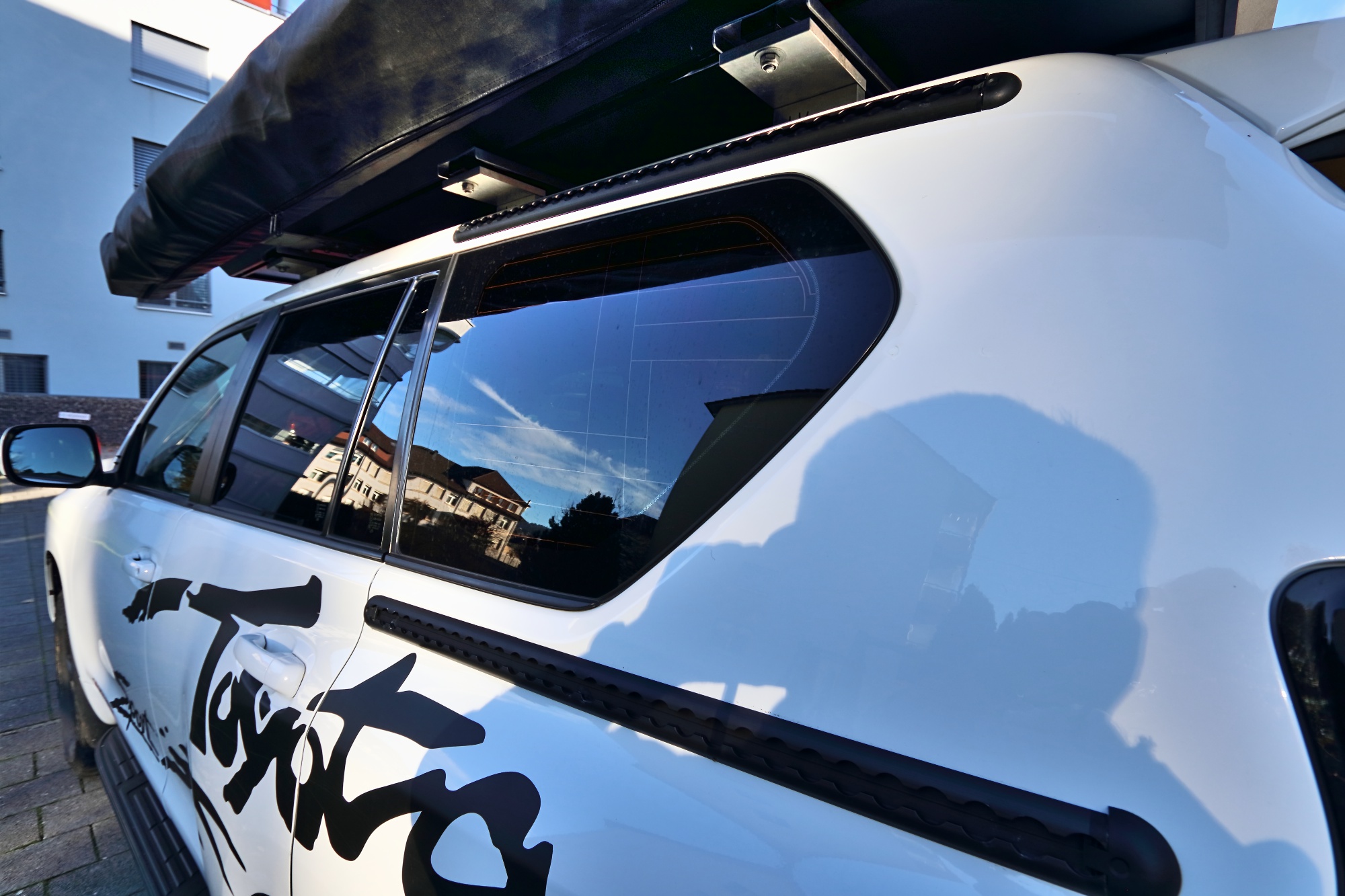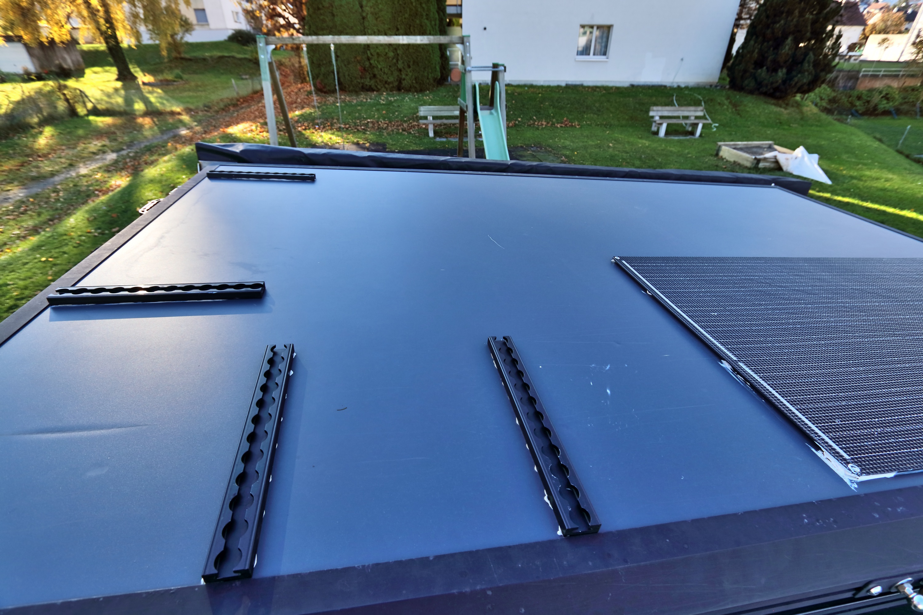 Mein Dachzelt ist übrigens ein Hartschalenzelt von GEAR ROCK aus Aluminium. Daran hängt die 270 Grad Markiese von ALU-CAP. Die Halterung habe ich auch selbst geplant und sie hält sehr stabil. Auf dem Zelt ist ein 100W Solarpannel hinterlüftet montiert – bring bei guter Sonnenbestrahlung so 80 Watt. Weiter habe ich auf dem Dach die Sandschaufel und die Sandbretter transportiert – daher die Airline Schienen.